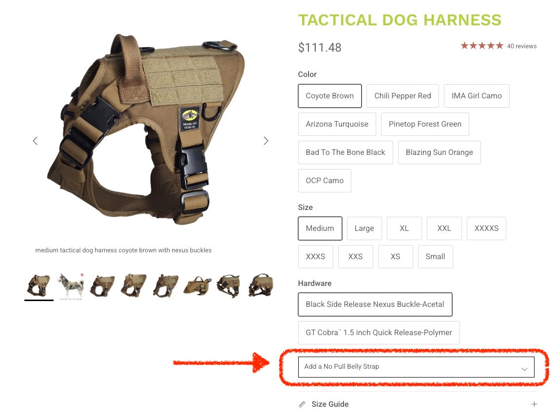 The No Pull Belly Strap™ only works with Shark Fin Gear Harnesses and Service Dog Vests.