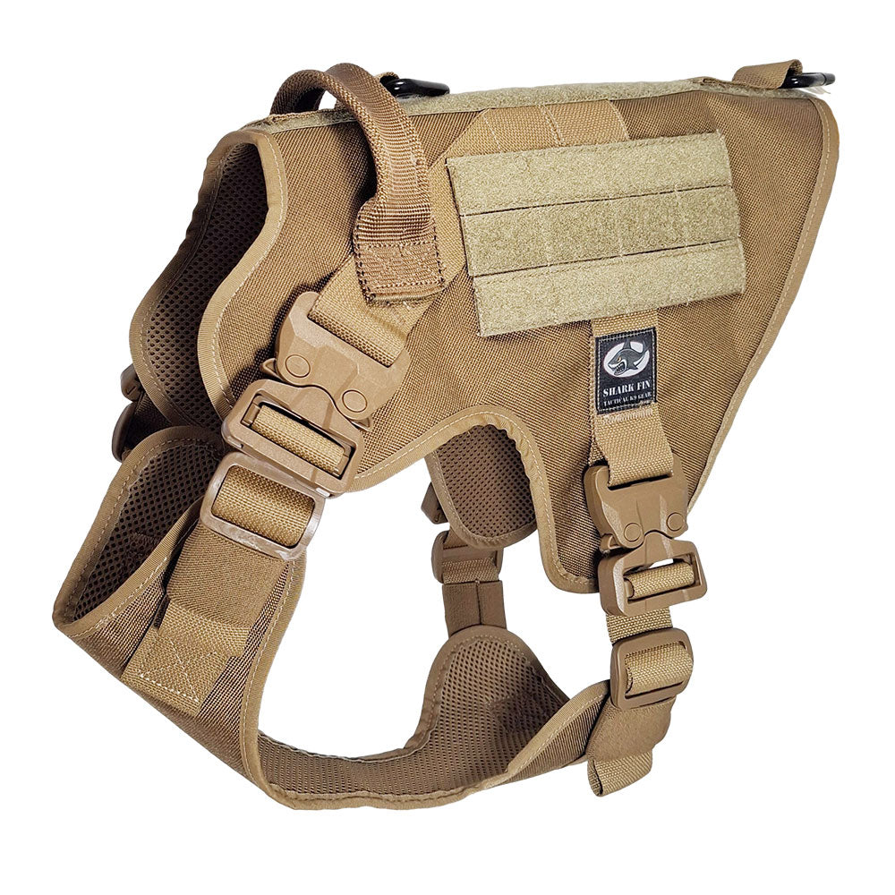 Shark Fin Gear proudly presents the finest tactical dog harness, crafted entirely in Tempe, Arizona, using MilSpec fabrics and webbing sourced exclusively from manufacturers in the USA. Designed to meet the rigorous demands of LEO and Military working dogs, our harnesses are trusted for use on various breeds, including German Shepherds, Belgian Malinois, Basset Hounds, Bloodhounds, and Labrador Retrievers. These breeds excel in tracking, trailing, apprehension, as well as bomb and drug detection tasks. Click here for SIZE GUIDE.