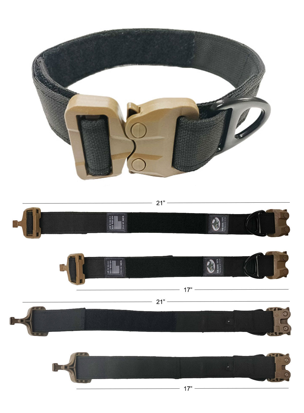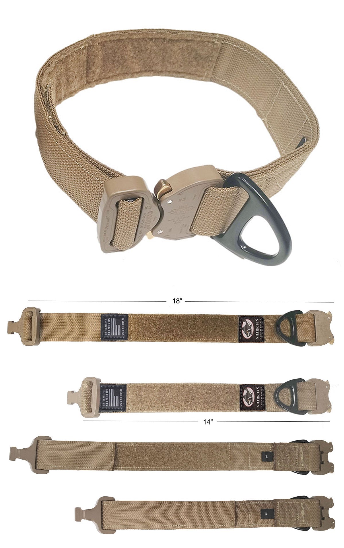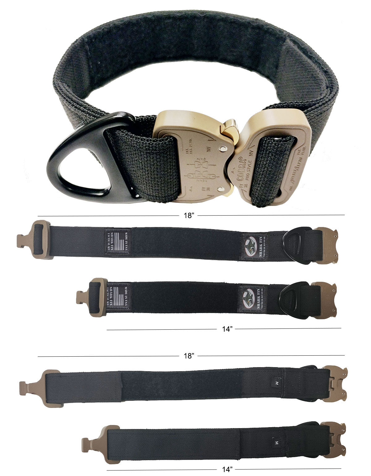 The webbing of the Shark Fin Gear Tactical collar is the 1.5 inch solution dyed Cordura® Nylon webbing. Most webbing is made and then dyed to a color; called Vat Dyed (cheap crap on Amazon). Solution Dyed webbing has the dye mixed with the plastic polymer and so the color is present throughout the webbing, not just on the outside. Think of the difference between a radish and a carrot; the radish is red on the outside only while the carrot is orange all the way through. The benefit is better color consistency in manufacturing, lower reflectivity especially in the IR spectrum, no color change with abrasion, and better resistance to sunlight fading. SFGC uses Solution dyed webbing made in the USA!
